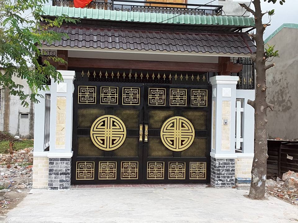 Mẫu cổng sắt đẹp C10 được nhấn bằng hoa sắt trống đồng mỹ thuật đã tạo trend xuyên suốt nhiều năm liên, đên nay mẫu cổng đẹp này vẫn chưa hết HOT.