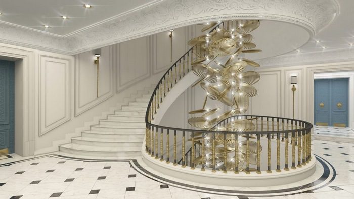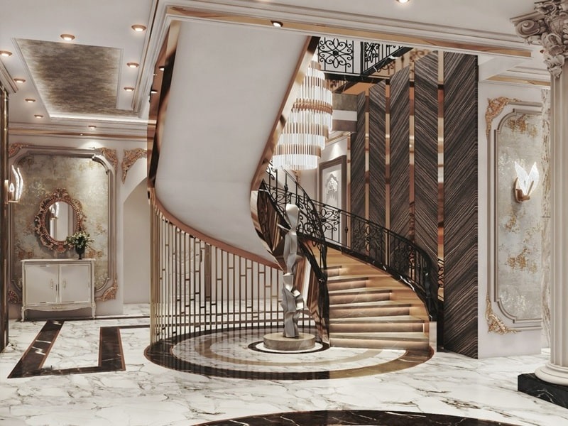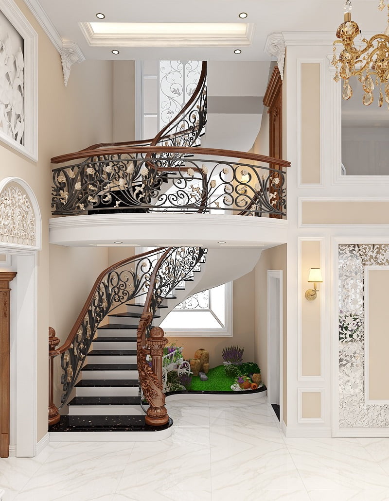 - Cầu thang xoắn ốc cho biệt thự: là loại cầu thang có các bậc thang xoay quanh một trục thẳng đứng, giống như hình dáng của vỏ ốc. Loại cầu thang này mang các đường nét gọn gàng tạo vẻ đẹp kiêu sa, sang trọng cho biệt thự. Đây cũng là một lựa chọn cho gia chủ có thể thể hiện sự uy nghi và đẳng cấp của biệt thự.