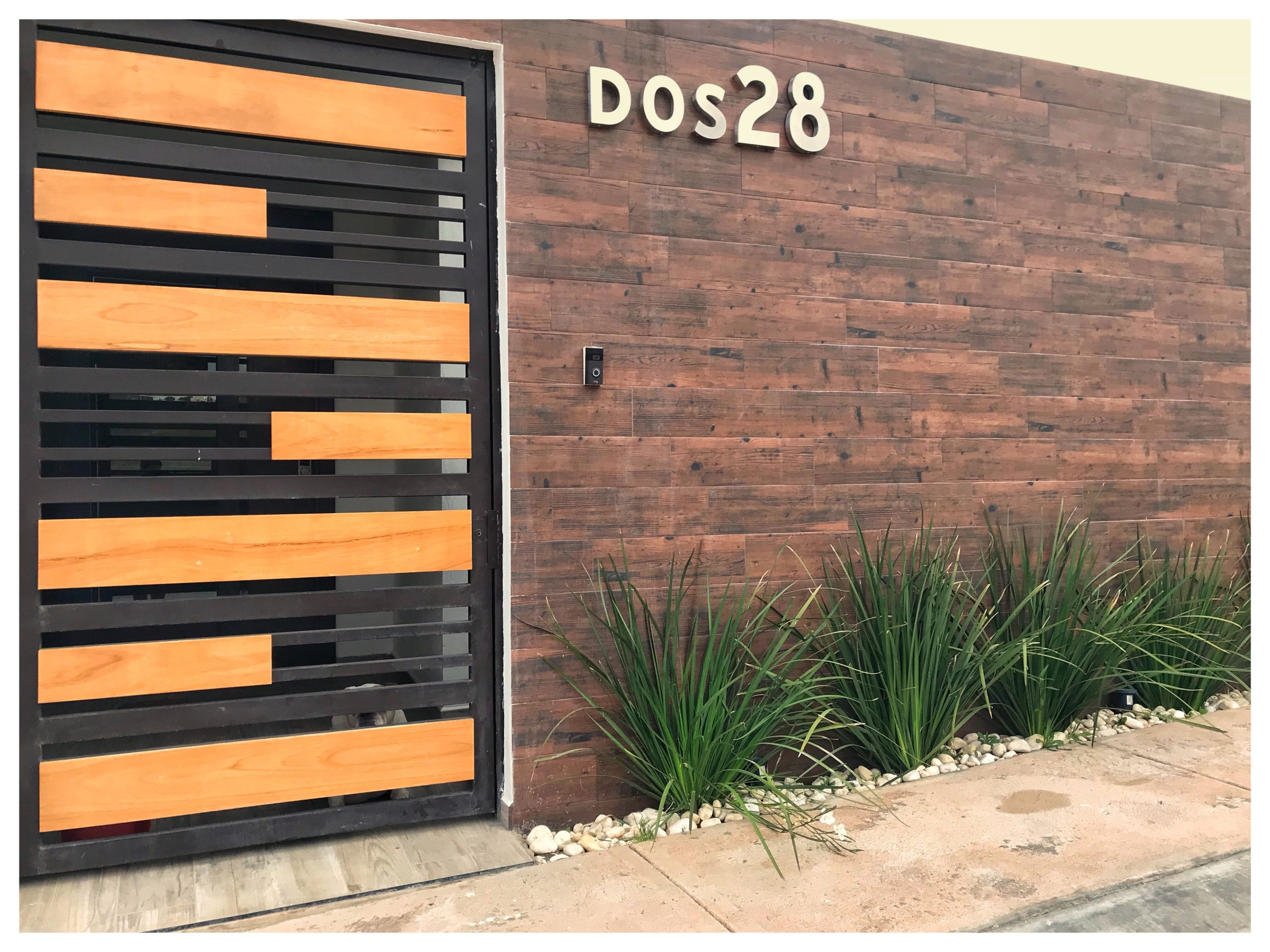 Nếu là người yêu thích sự độc đáo, bạn cũng có thể yêu cầu làm cho mình một cánh cổng gỗ ngoài trời được ốp bởi nhiều thanh gỗ nhựa có màu sắc khác nhau.