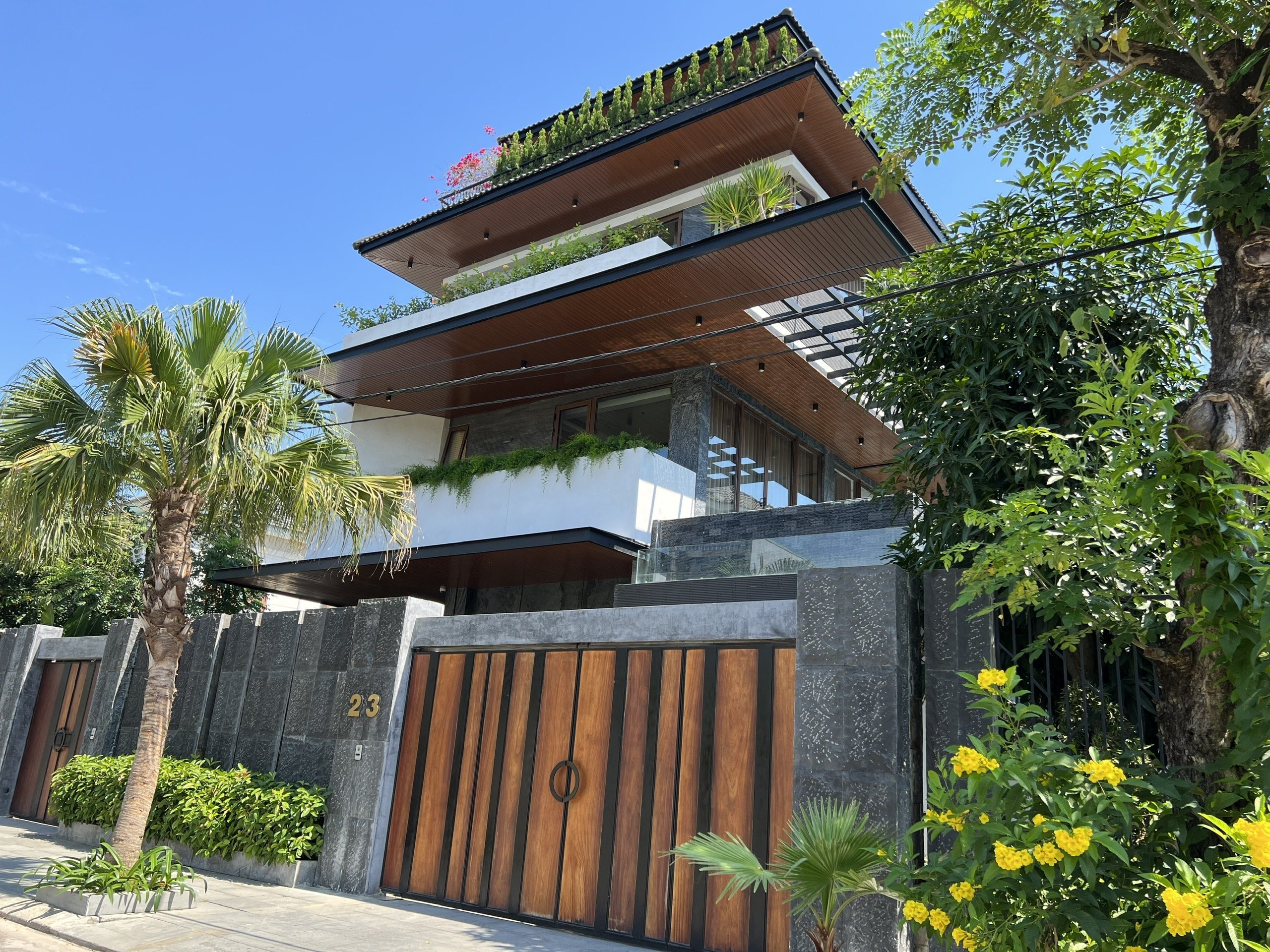 Trong khi đó, vẻ hiện đại và mạnh mẽ lại được tạo ra từ thiết kế đẹp mắt, phong phú. Từ sự kết hợp của các thanh gỗ nhựa, thanh sàn gỗ nhựa kết hợp với thép hộp/inox…